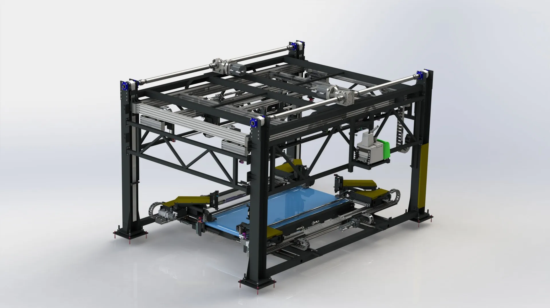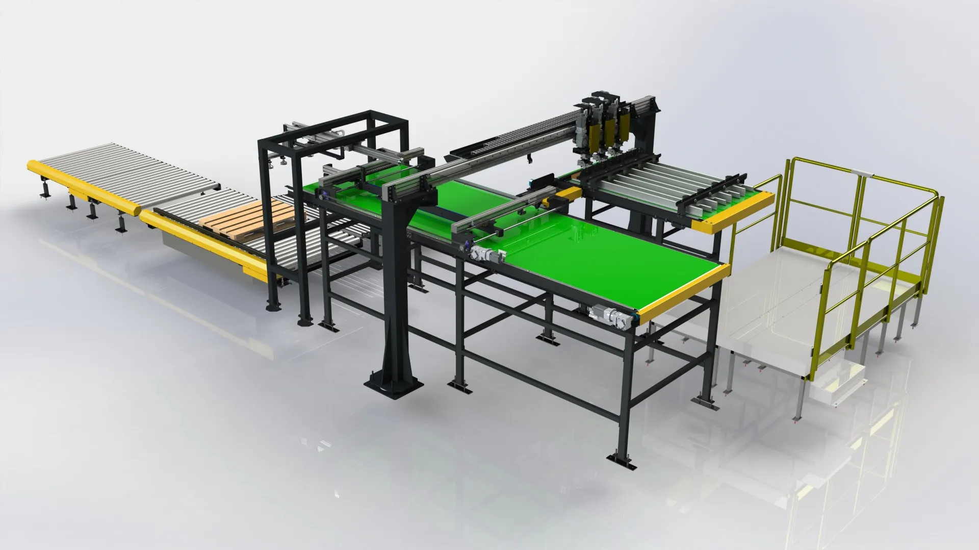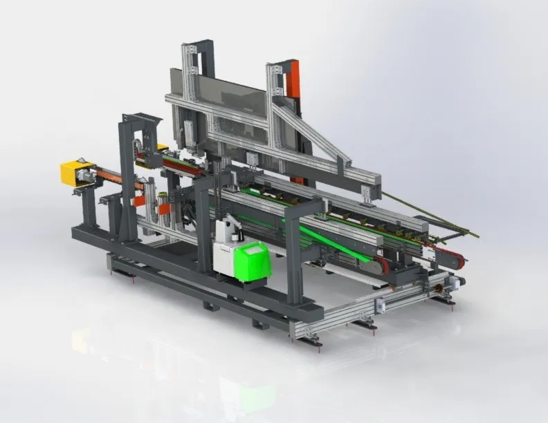 Zadaniem kolejnej wdrożonej maszyny było przyklejanie podstawek oraz innych elementów palety kartonowej do tacy palety. Jednym z najważniejszych wymagań wobec zastosowanego rozwiązania była synchroniczna praca trzech manipulatorów na jednej osi z wykorzystaniem systemu antykolizyjnego oraz zachowanie dokładności odkładania oraz klejenia. Pozycję oraz ułożenie przyklejanych elementów można dowolnie konfigurować przy pomocy dostarczanego z maszyną panelu operatorskiego. Zastosowano także w pełni zautomatyzowany system pobierania tac tekturowych.