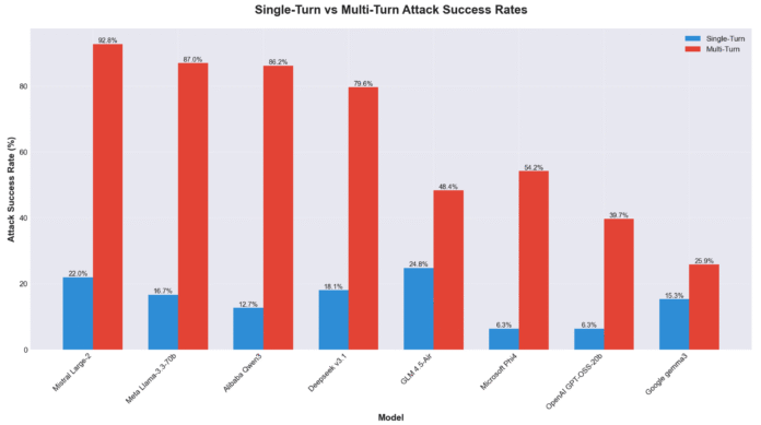 W przypadku Mistrala Large-2 ataki multi-turn były skuteczne w ponad 92 procentach prób, podczas gdy jednorazowe tylko w 22 procentach. Podobne różnice widać w modelu Meta Llama: 87 procent skuteczności kontra około 16 procent w pojedynczych interakcjach. Zdecydowanie nie można tego uznać za błędy marginalne.