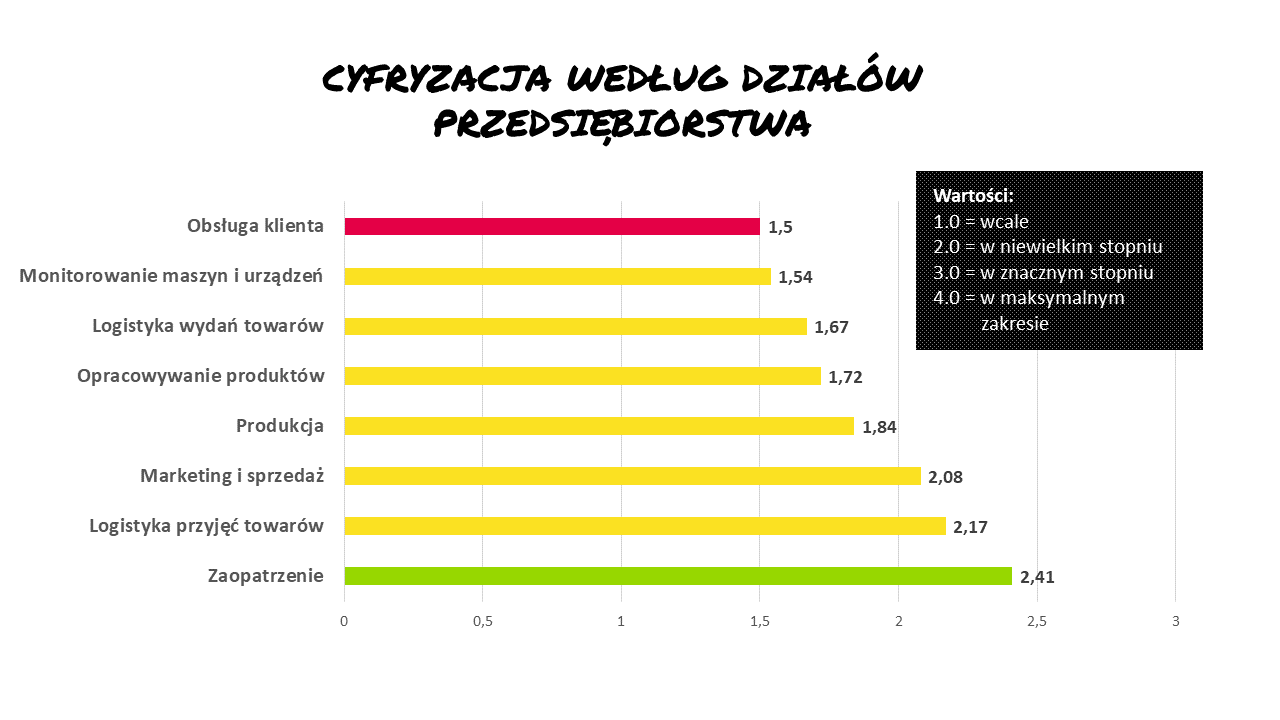 W całym badaniu dotyczącym cyfryzacji na czele znalazły się takie obszary jak zaopatrzenie, logistyka przyjęć towarów oraz marketing i sprzedaż. Z ankiety wynika również, że obszarami zaniedbywanymi podczas transformacji cyfrowej są logistyka wydań towarów, monitorowanie maszyn i instalacji a przede wszystkim obsługa klienta. Są to obszary, które przy odpowiedniej optymalizacji mogą pomóc w zdobyciu kluczowej przewagi nad konkurencją.