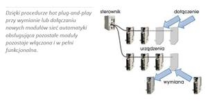 Znacznie bardziej efektywną procedurą zarządzania siecią jest umożliwienie ciągłego funkcjonowania maszyny lub urządzenia dzięki skorzystaniu z metody hot plug-and-play ? serwisu przy zachowaniu funkcjonalności urządzenia. Wiele sieci automatyki dedykowanych dla aplikacji z elementami ruchomymi, w tym wymieniane już wcześniej popularne standardy, zapewnia obsługę takiej metody serwisowania. Dzięki niej moduły sterownicze mogą być łatwo wymieniane czy dodawane do systemu, bez konieczności przerywania komunikacji w systemie automatyki między sterownikiem nadrzędnym i pozostałymi modułami sieciowymi (rysunek 4). Taka architektura systemu, wraz z pomocniczymi narzędziami serwisu i zarządzania, znacznie ułatwia samą implementację systemu oraz jego późniejsze użytkowanie czy modernizację.