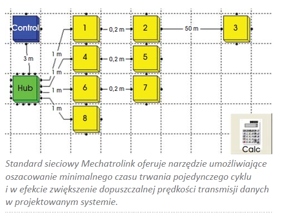 Rzeczywista szybkość transmisji danych w większości sieci ethernetowych jest nie do ustalenia, uwzględnia bowiem cały szereg zmieniających się parametrów sieci, determinujących rzeczywisty czas trwania cyklu transmisji. Niektóre organizacje (np. Mechatrolink) oferujące sieci sterowania dla aplikacji przemysłowych, dostarczają też pewne narzędzia komputerowe, pozwalające użytkownikowi na wprowadzenie modelu architektury sieci i obliczenie czasu trwania cyklu (rysunek 3). W takiej symulacji uwzględniana jest ilość danych konieczna do wysłania do każdego modułu w aplikacji, całkowita liczba takich modułów, długość kabli sieciowych między modułami i sterownikami, liczba koniecznych hubów oraz czasy opóźnienia przetwarzania sygnałów w modułach. Dzięki symulacji możliwe jest uzyskanie odpowiedzi, czy dany typ sieci i jej projektowana architektura zapewnią właściwe funkcjonowanie systemu sterowania, wraz z wymaganą szybkością transmisji danych.