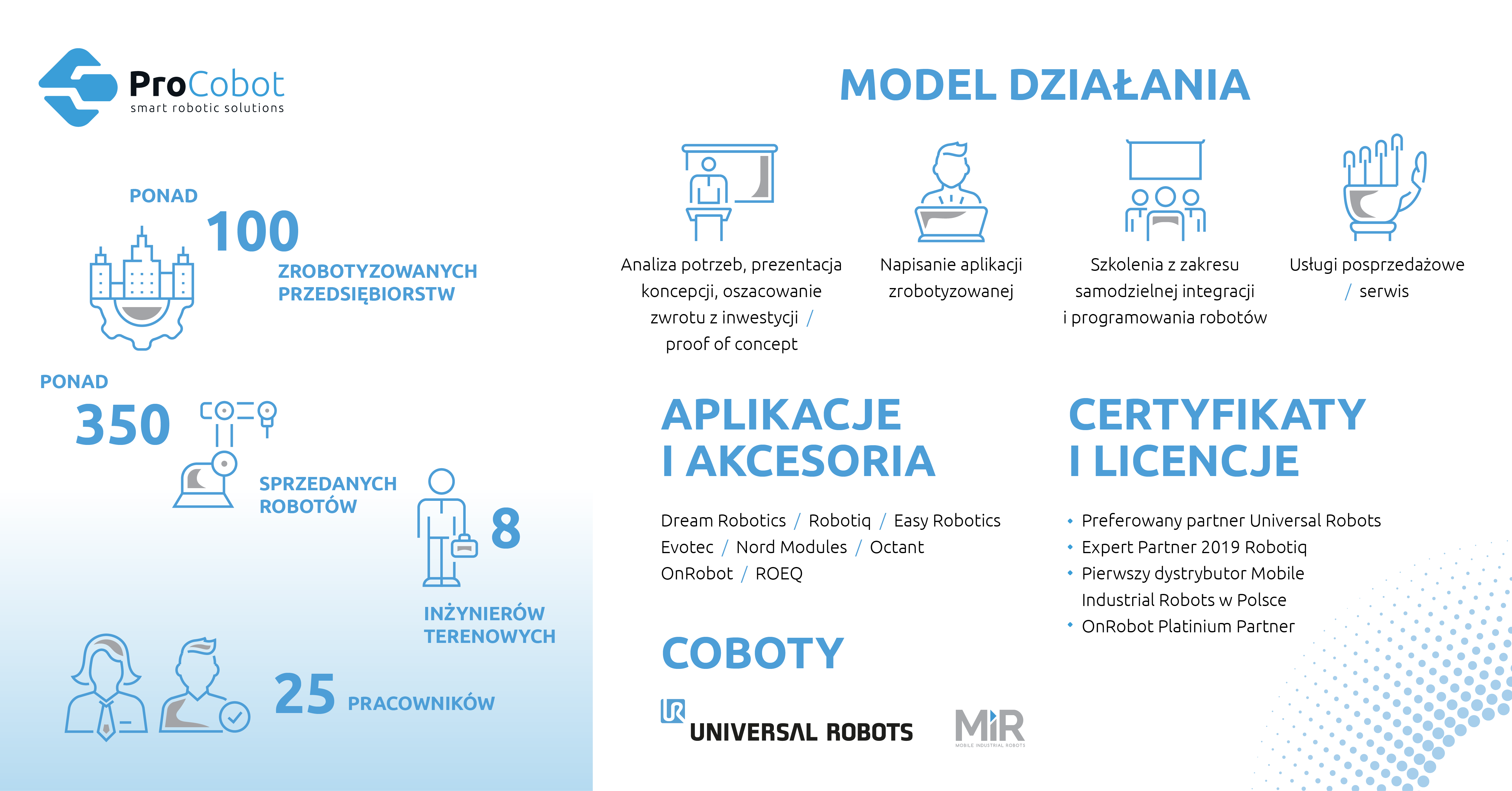 ProCobot jest dynamicznie rozwijającą się polską firmą inżynierską, wprowadzającą na rynek innowacyjne, w pełni zintegrowane systemy i rozwiązania oparte o roboty współpracujące (coboty). ProCobot współpracuje z pionierami i najbardziej renomowanymi światowymi dostawcami z tego najszybciej rozwijającego się obszaru nowoczesnych technologii robotyzacji. Kompleksowo doradza klientom jak poprawić produktywność, obniżyć koszty i ulepszyć jakość produkcji poprzez wykorzystanie cobotów w rozwiązaniach i aplikacjach współpracujących. Firma prowadzi profesjonalne szkolenia, wykonuje studia wykonalności (Proof of Concept), posiada bogato wyposażony showroom.