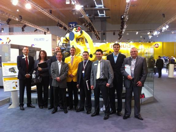 Konrad Grohs, Country Manager FANUC Robotics (w żółtej marynarce) a także m. in Michael Majchrzak, wydawca Control Engineering Polska podczas Targów EMO 2011 Hanover