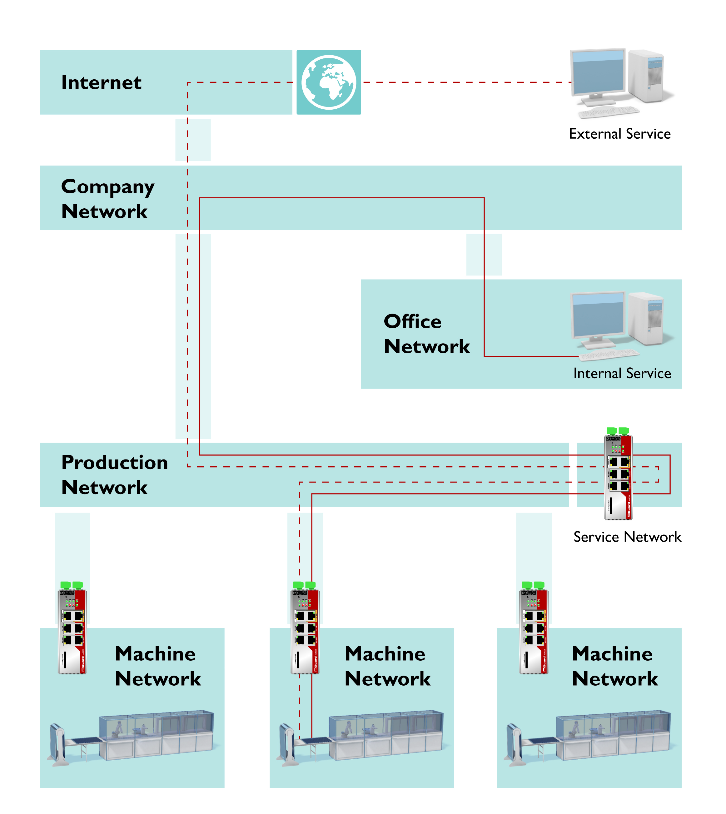 To tej najgłębszej warstwy, dostęp mogą mieć jedynie odpowiednio przeszkoleni pracownicy. Serwisanci natomiast, by dokonać pracy na danych, uzyskują dostęp poprzez sieć komórkową, która w znacznym stopniu zagraża bezpieczeństwu całej sieci produkcyjnej. To przestarzałe rozwiązanie. Jego następca ? system zdalnej konserwacji VPN co prawda rozwiązuje część problemów, ale nadal nie gwarantuje pełnego bezpieczeństwa.