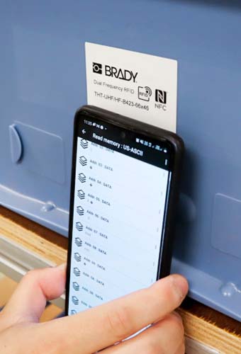 Wystarczy dotknąć etykiety smartfonem z funkcją NFC, aby odczytywać i zapisywać dane. Wszystkie produkty lub przedmioty z etykietą RFID o podwójnej częstotliwości dają możliwość uczestniczenia w programach śledzenia i monitorowania całym łańcuchom dostaw, od produkcji części, montażu, logistyki i dystrybucji po instalatorów, konserwatorów i użytkowników końcowych. Można dodać takie dane, jak kody oraz łącza do informacji online lub do dokumentów przechowywanych w bazach danych.