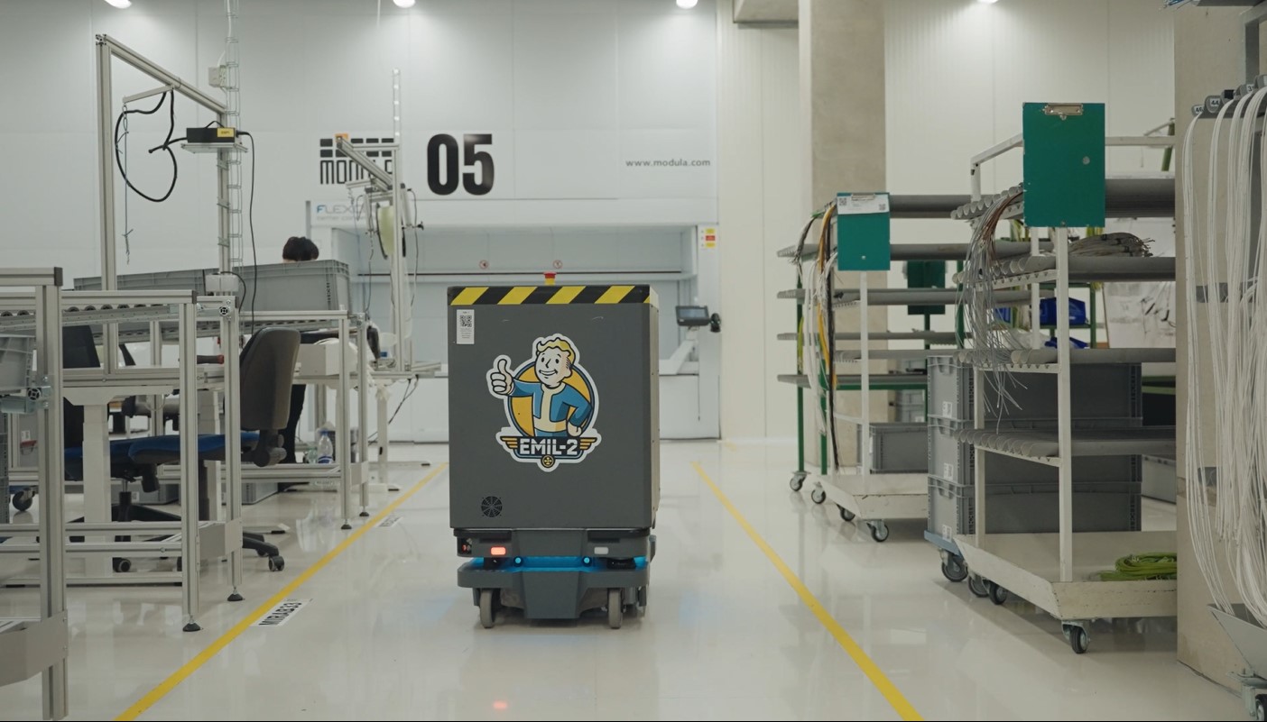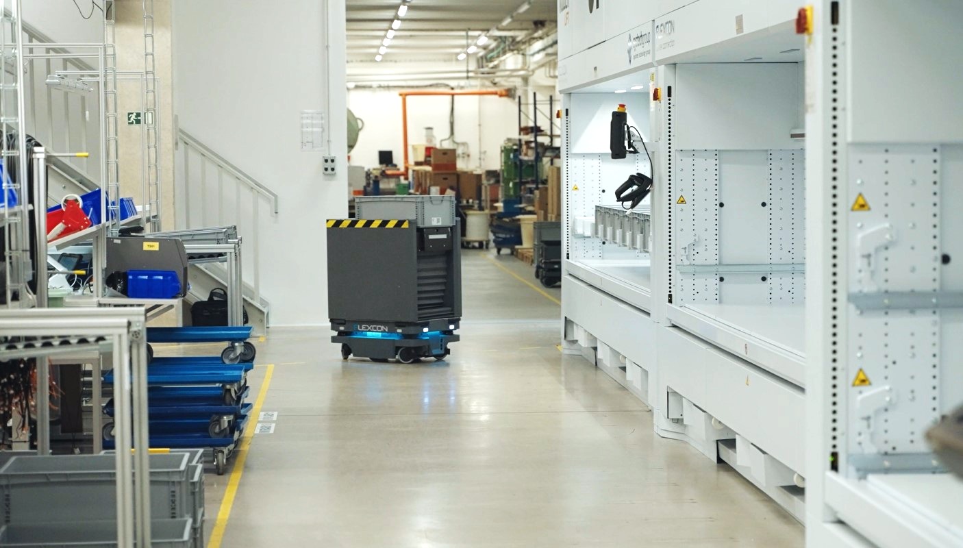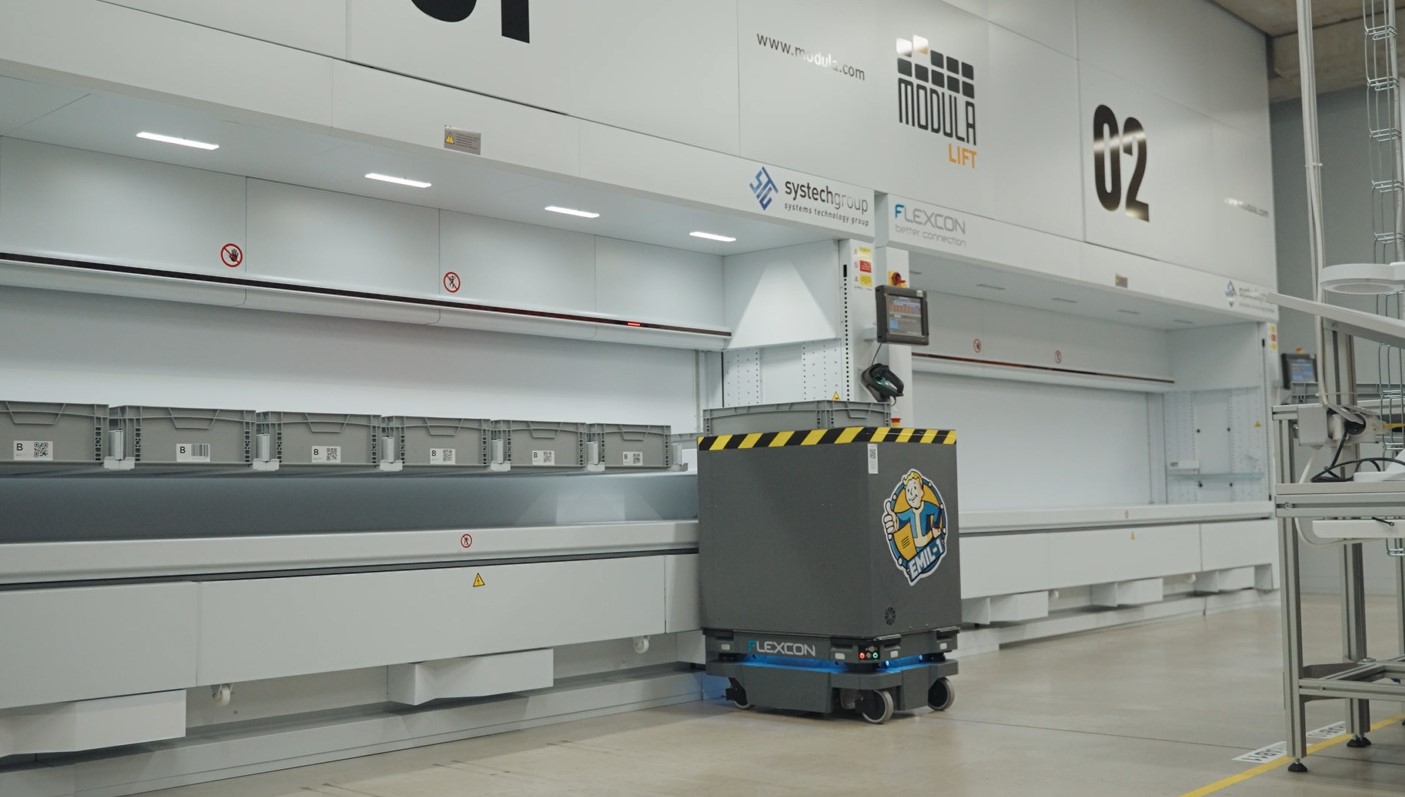 Najnowszym przykładem jest Flexcon – czeski producent wiązek kablowych i zespołów elektromechanicznych – który przekształcił ręczny, wielokondygnacyjny przepływ materiałów, wdrażając flotę robotów MiR250 AMR ściśle zintegrowanych z magazynami pionowymi (VLM) oraz istniejącym oprogramowaniem ERP/ WMS. Roboty AMR autonomicznie poruszają się po zakładzie, pobierają tacki z częściami z magazynu i dostarczają je na produkcję bez udziału człowieka, wykorzystując specjalnie przystosowane moduły górne oraz inwentaryzację wspieraną kodami QR w celu wyeliminowania ręcznego wprowadzania danych i ograniczenia obciążenia fizycznego. Efekt jest wymierny: Flexcon przetwarza obecnie około 1000 pozycji na zmianę przy znacznie mniejszej liczbie pracowników zaangażowanych w kompletację i obsługę materiałów, redukując czas chodzenia i liczbę ręcznych operacji.