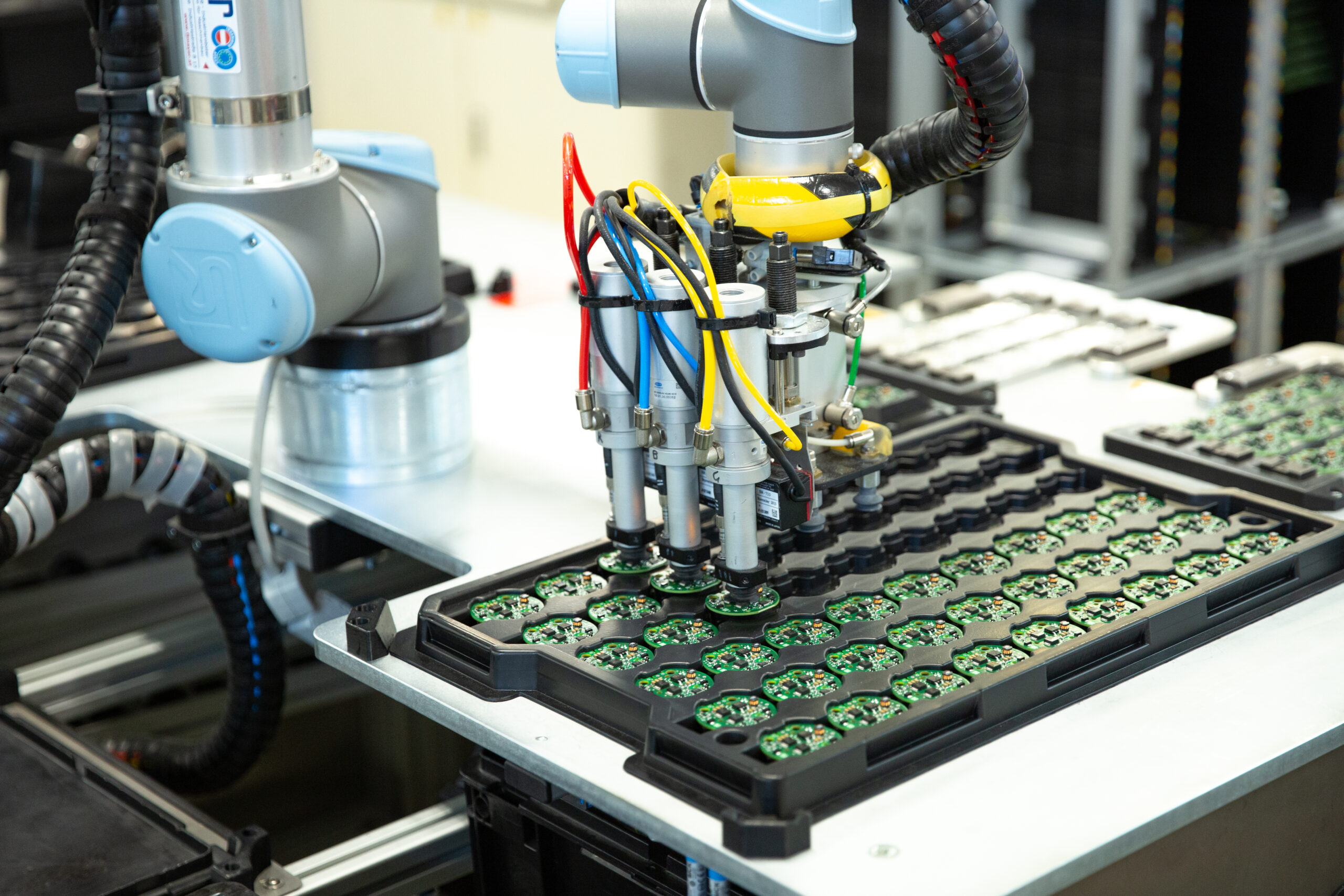 W produkcji elektroniki coboty są często wykorzystywane do wspierania pracowników w szerokim zakresie zadań montażowych, takich jak wkręcanie śrub, klejenie, lutowanie, wkładanie, dociskanie, montaż, wspomaganie podnoszenia czy pobieranie elementów z pojemników (bin picking). Każda sytuacja, w której pracownik wykonuje monotonne, powtarzalne lub nieergonomiczne zadania, stanowi potencjalny obszar do zastosowania robota współpracującego. W zakładach prefabrykacji, poza linią produkcyjną, cobot może np. manipulować komponentem w celu precyzyjnego ustawienia go do końcowego dokręcania śrub przez człowieka, a także grupować i pozycjonować przewody tak, aby operator mógł wykonać zaciskanie konektorów. W zależności od wielkości lub wartości projektu możliwa jest integracja dodatkowej automatyzacji, takiej jak systemy wizyjne i specjalistyczne narzędzia, umożliwiające realizację delikatnych zadań, np. automatycznego zaciskania czy różnego rodzaju kontroli jakości i ciągłości.