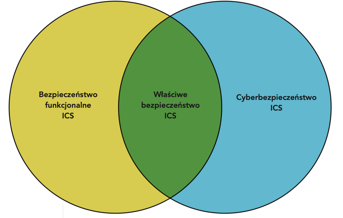 Rysunek pokazuje, że właściwe bezpieczeństwo przemysłowego systemu sterowania (ICS) oznacza, że zarówno bezpieczeństwo funkcjonalne, jak i cyberbezpieczeństwo muszą być spełnione i zintegrowane. Właściwe bezpieczeństwo ICS można osiągnąć, gdy oba obszary są odpowiednio uwzględnione.