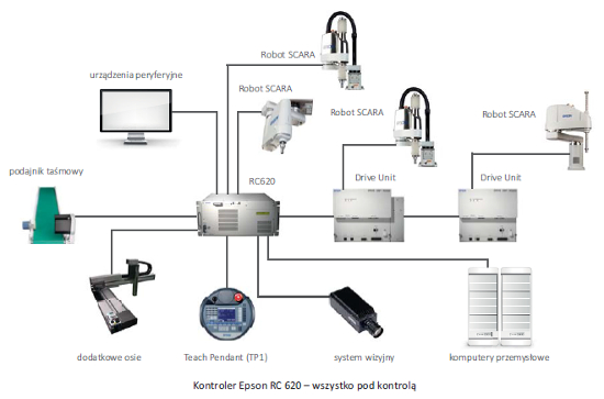 Roboty EPSON SCARA mogą być sterowane za pomocą dwóch kontrolerów ? RC180 lub RC620+. Pozwala to na dobór optymalnego rozwiązania do danej aplikacji. Oba kontrolery współpracują z oprogramowaniem RC+ do wspomagania projektowania aplikacji zrobotyzowanych. Kontrolery robotów EPSON wyposażone są w pełną funkcjonalność związaną z bezpieczeństwem aplikacji oraz mogą pełnić funkcję nadrzędną w aplikacji. Kontroler jest integralną częścią robota i dostarczany jest wraz z nim.