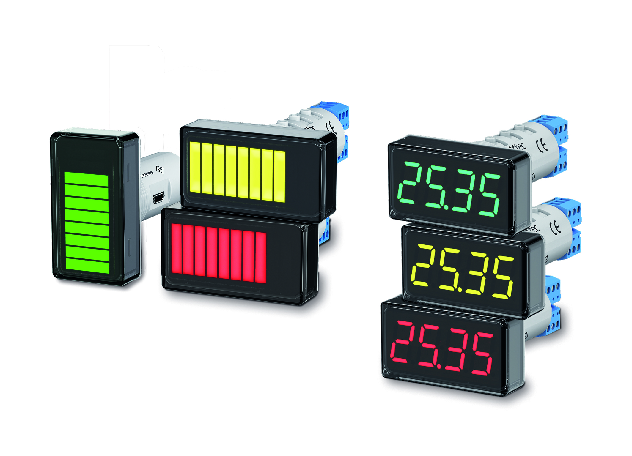 ITP15-M (na zdjęciu z lewej) to trójkolorowy wskaźnik słupkowy LED z 10 segmentami (1 segment = 10% skonfigurowanej skali). Uniwersalne mierniki panelowe ITP17 wyświetla wartości procesowe na czterocyfrowym, trójkolorowym (zielony/żółty/czerwony) wyświetlaczu; progi zmiany kolorów są w obu urządzeniach programowane przez użytkownika. | Zdjęcie: akYtec GmbH