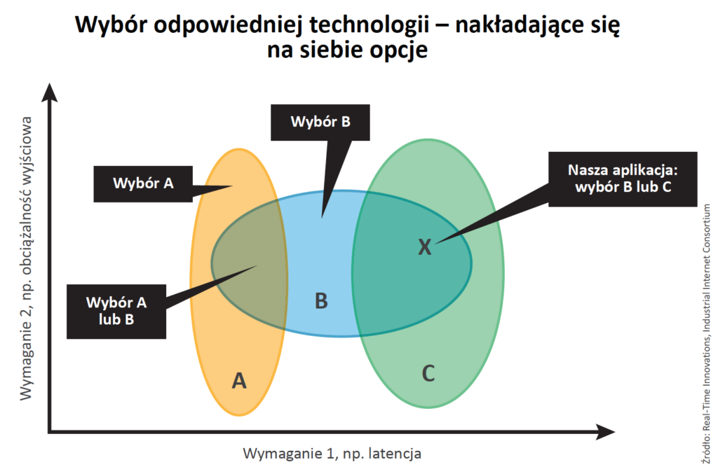 Dlatego właśnie w rzeczywistości przestrzeń IIoT jest tak wielka, że opcje technologiczne rzadko się nakładają, jeśli w ogóle. Współcześnie wyzwaniem dla wyboru architektury sieciowej w przestrzeni IIoT nie jest zatem to, że nie tylko jedna z wybieranych nakładających się technologii może całkiem rozwiązać problem. Wyzwaniem jest zrozumienie tych technologii, porównanie ich zamierzonych obszarów aplikacyjnych i wybór takiej, która najlepiej pasuje do specyficznych wyzwań dla danej aplikacji. Na pewno rozciąganie obszarów aplikacyjnych jakiejś technologii poza wszelkie proporcje może sprawić, że wszystko będzie działać. Ale będzie to wymagało dużo dodatkowej pracy i projektu, który w efekcie końcowym nie jest optymalnym rozwiązaniem. Jeśli poszukujemy bardziej realistycznej mapy sytuacji, to lepszym rozwiązaniem będzie pokazany na rys. 2 rozrzucony diagram Venna, niż nakładające się obszary pokazane na rys. 1.