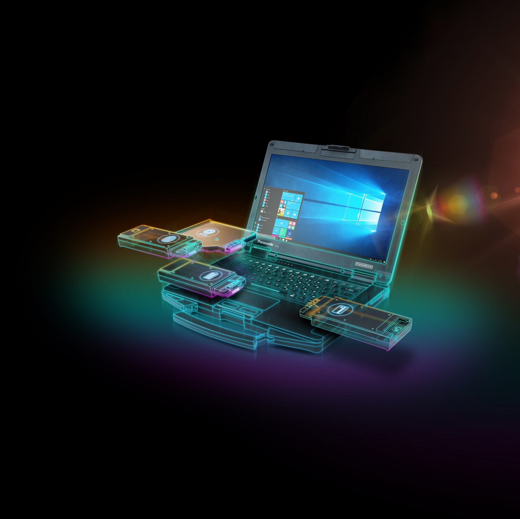 TOUGHBOOK 55 pozwala użytkownikom zwiększyć możliwości grafiki, dodać czytnik Smart Card, dodatkową pamięć lub napęd DVD lub Blu-Ray w prosty sposób (switch, fit and click) na pomocą nowego dodatku TOUGHBOOK Universal Bay. Ponadto przednie gniazdo rozszerzeń można wykorzystać do zintegrowania czytnika linii papilarnych, RFID, zwykłego czytnika Smart Card lub do dodania drugiej baterii.