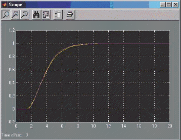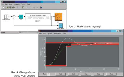 W tym celu w programie SIMULINK zaprojektowano układ (rysunek 3.), do którego dołączono element NCD, który umożliwia modyfikowanie parametrów (w naszym przypadku nastaw P i I regulatora) tak, aby osiągnąć możliwie najlepsze przebiegi czasowe wybranych zmiennych. W NCD nastawy regulatora zostaną dostrojone automatycznie na podstawie zadanego przez użytkownika (w formie graficznych ograniczeń) kryterium jakości (rysunek 4.). Grube, czerwone linie na rysunku określają maksymalne dopuszczalne przeregulowanie, a użytkownik może za pomocąmyszy dowolnie te linie przesuwać, określając w ten sposób kształt przebiegu sygnału wyjściowego.