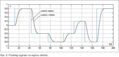 Przebieg zmian wartości zadanej oraz odpowiadający mu przebieg sygnału na wyjściu obiektu przedstawia rysunek 8. Jak widać, nastawy zostały dobrane na tyle poprawnie, że układ nie wykazuje przeregulowań, czyli realizuje założone kryterium jakości.