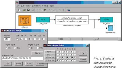 Mając takie środowisko sprzętowe z oprogramowaniem narzędziowym, można zbudować model obiektu w PC. Na rysunku 6. przedstawiony jest schemat blokowy połączenia obiektu w postaci transmitancji WE/WY karty pomiarowej, której zakres napięć odpowiada poziomom napięć modułów analogowych większości sterowników.