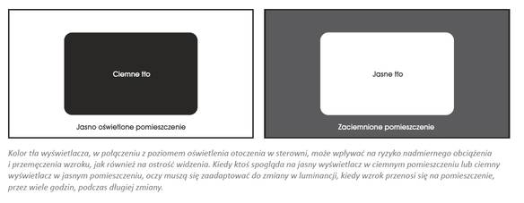 Dlaczego więc nie zastosować białego tła wyświetlacza zamiast szarego? Przyczyną jest fakt, że kolor tła wyświetlacza w połączeniu z poziomem oświetlenia otoczenia w sterowni może mieć wpływ na ryzyko nadmiernego obciążenia i przemęczenia wzroku, jak również na ostrość widzenia. Jeśli ktoś patrzy na jasny wyświetlacz w ciemnym pomieszczeniu lub na ciemny wyświetlacz w jasnym pomieszczeniu, oczy muszą się przystosować do zmiany w luminancji przy przenoszeniu wzroku z pomieszczenia na wyświetlacz. Przy kolejnym spojżeniu na jasne i ciemne źródła światła, przez okres 12-godzinnej zmiany, operatorzy mogą doświadczać nadmiernego obciążenia i przemęczenia wzroku.