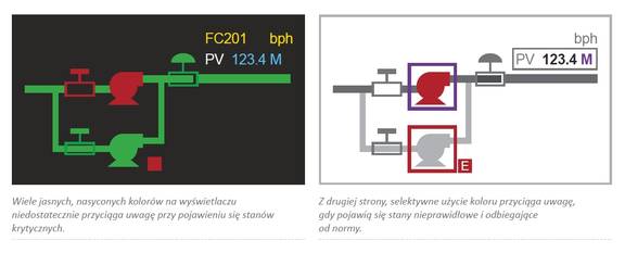 Osiągniętemu rozwojowi rozproszonych systemów sterowania (DCS), które stanowią obecnie platformy z rozwiązaniami komputerowymi typu PC, towarzyszy znaczna zmiana w możliwościach przedstawiania operatorom danych oraz informacji. I tak w szczególności, możliwość pracy pierwszej generacji wyświetlaczy kolorowych schematów ewaluowała od ograniczonego wykorzystania ośmiu kolorów z pełną lub ograniczoną do połowy intensywnością barwy, do potencjalnie milionów kolorów z możliwością dobierania kombinacji nasycenia barwy, odcieni oraz poziomów intensywności.