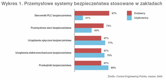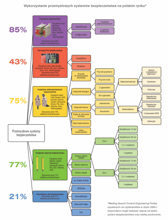 Na polskim rynku działa wielu dostawców przemysłowych systemów bezpieczeństwa. Prawie 90% z nich posiada w ofercie kompaktowe lub modułowe sterowniki PLC bezpieczeństwa. Z przeprowadzonej wśród użytkowników ankiety wynika, że sterowniki PLC bezpieczeństwa stosowane są przez 43% zakładów. Mniej popularne są przemysłowe sieci bezpieczeństwa, które funkcjonują jedynie u 21% przebadanych użytkowników. Chętnie natomiast oferowane są przez dostawców działających na polskim rynku ? w sprzedaży ma je około trzy czwarte z nich. Dostępnych jest szereg różnych standardów tego typu. Najbardziej znanymi są: AS-i (Actuator Sensor Interface), Safety At Work, PROFIsafe, DeviceNet Safety oraz Ethernet/IP Safety. Poza tym użytkownicy mogą zdecydować się na: Ethernet Powerlink Safety, CC-Link Safety, SIMATIC Safety, SafetyBUS lub Safety over EtherCAT.