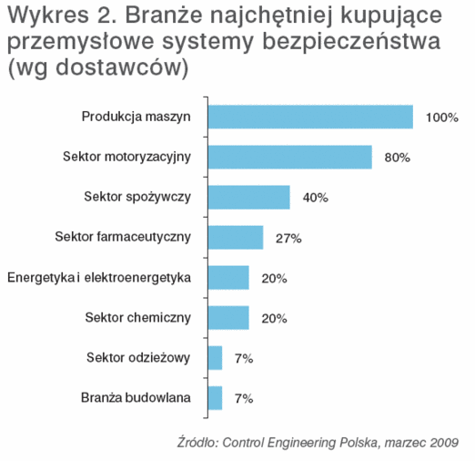 Kluczowymi odbiorcami przemysłowych systemów bezpieczeństwa są producenci maszyn oraz przedstawiciele sektora motoryzacyjnego. Prawie połowa klientów reprezentuje sektor spożywczy, a około jedna czwarta ? farmaceutyczny, chemiczny oraz energetykę i elektroenergetykę. Najmniej kupujących należy do branży odzieżowej i budowlanej (patrz: wykres 2.).