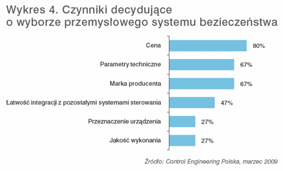 Według dostawców i użytkowników na wybór konkretnego systemu bezpieczeństwa w największym stopniu wpływa jego cena. Respondenci Control Engineering Polska uważają ponadto, że większość podejmowanych decyzji zakupowych kształtowanych jest przez markę producenta i parametry techniczne urządzeń.