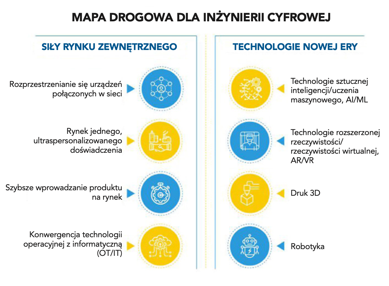 Rozważmy inżynierię cyfrową jako koncepcję technologiczną, która pozwala na opracowanie inteligentnego, usieciowionego ekosystemu w celu zwiększenia doświadczeń i optymalizacji funkcjonalności. Poprzez połączenie rzeczywistości cyfrowej, fizycznej i wirtualnej inżynieria cyfrowa oraz związane z nią technologie nowej ery obecnie definiują od nowa sposób, w jaki produkty są opracowywane i wytwarzane dla użytkowników końcowych.