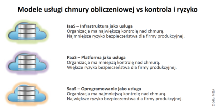 ? Platforma jako usługa (PaaS): Dzięki modelowi PaaS CSP zapewnia infrastrukturę oraz platformę do tworzenia aplikacji. Firma produkcyjna posiada mniej elementów infrastruktury wymagających zarządzania i zachowuje kontrolę nad niektórymi funkcjami administracji systemu. Pozwala to zmniejszyć odpowiedzialność przedsiębiorstwa, ale przekłada się jednocześnie na mniejszą kontrolę nad zasobami, co stwarza większe zagrożenie bezpieczeństwa dla organizacji.