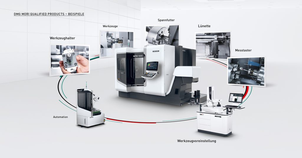 Urządzenia pomiarowe, uchwyty narzędziowe i systemy przenoszenia to tylko trzy przykłady produktów peryferyjnych i urządzeń od zewnętrznych dostawców, którymi DMG MORI uzupełnia swoje rozwiązania produkcyjne. Te i inne komponenty są zorientowane na wysoką jakość maszyn CNC. Producent obrabiarek stosuje program DMG MORI Qualified Products (DMQP) określający wysokie kryteria jakości. Kryteria te obejmują wewnętrzną certyfikację produktów, ich spójność cenową i odpowiednie gwarancje.
