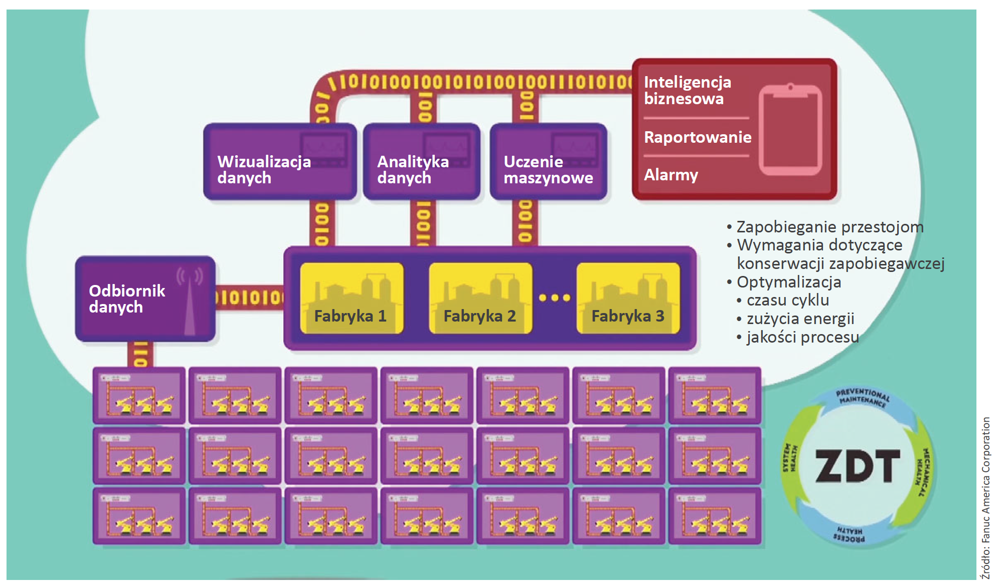Koncern General Motors (GM) zaprzęga obecnie do pracy technologię Internetu Rzeczy (IoT) oraz bloki konstrukcyjne technologii Przemysłu 4.0. Dostawca robotów dla tego producenta samochodów i jego partner strategiczny, korporacja Fanuc America, pomaga GM w budowie solidnych fundamentów pod inteligentną produkcję. Firmy GM, Fanuc oraz Cisco opracowały wspólnie rozwiązanie o nazwie ?zerowy czas przestoju? (ang. Zero Down Time ? ZDT), które wykorzystuje platformę oprogramowania opartą na technologii chmury obliczeniowej do analizowania danych zbieranych przez roboty pracujące w fabrykach koncernu GM w celu wykrywania potencjalnych problemów, które mogłyby doprowadzić do przestojów na produkcji.