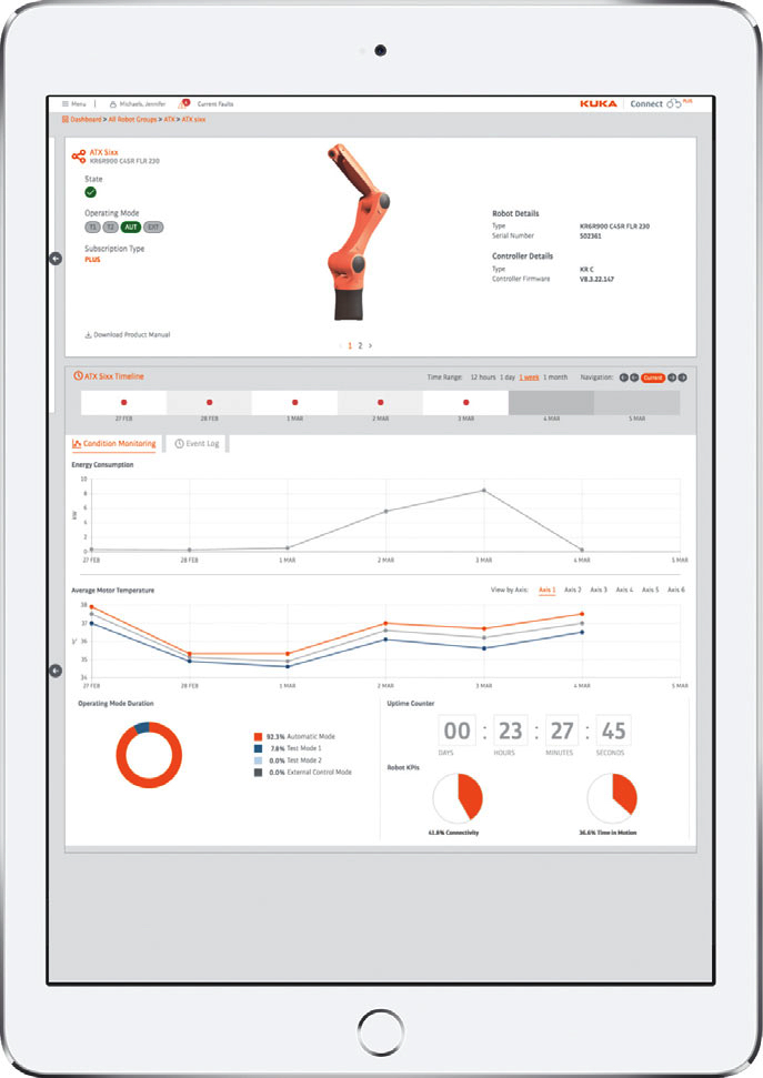 Jeśli chodzi o monitoring kondycji sprzętu, platforma KUKA Connect jest zaprojektowana do dostarczania specyficznych, kluczowych wskaźników efektywności (KPIs) robotów, aby pomóc personelowi technicznemu i wykonującemu prace konserwacyjne w szacowaniu jakości funkcjonowania robotów. Andy Chang podaje konkretny przykład ? obserwację wykresów temperatur pracy dla różnych osi robota. Jeżeli pracownik produkcji lub utrzymania ruchu zaobserwuje, że trend na wykresie temperatury pewnej osi robota wykazywał wzrost w ciągu ostatniego tygodnia, to prawdopodobnie oznacza to dwie rzeczy: albo skrzynia przekładniowa przegrzewa się z jakiegoś powodu, albo należy zmniejszyć obciążenie robota, gdyż obiekt podnoszony przez robota być może ma zbyt dużą masę w stosunku do tej, do podnoszenia której został zaprojektowany.