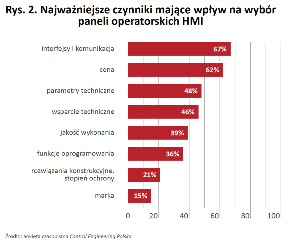 Zdaniem ankietowanych użytkowników najważniejszymi czynnikami mającymi wpływ na wybór paneli operatorskich HMI są interfejsy i komunikacja (67%) ? rys. 2. Na drugim miejscu znalazła się cena (62%), a na trzecim ? parametry techniczne (48%). Nie bez znaczenia są również: wsparcie techniczne (46%), jakość wykonania (39%), funkcje oprogramowania (36%), rozwiązania konstrukcyjne oraz stopień ochrony (21%), a także marka (15%).