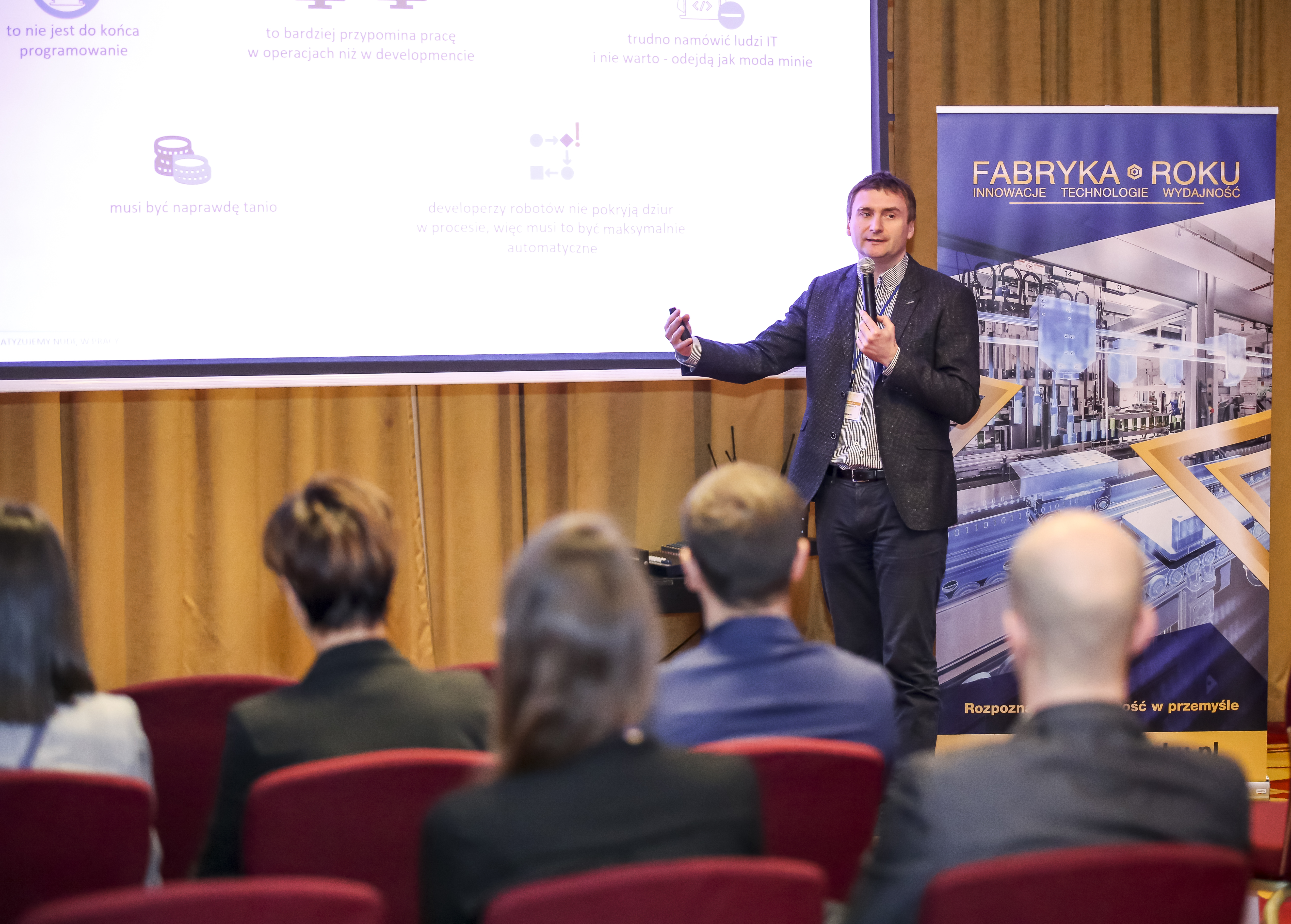 Na pytania, fabryka robotów czy software house oraz o tym, jak zbudować efektywny zespół automatyzujący operacje starał się odpowiedzieć Mariusz Pultyn CTO w Digital TeamMates. Jak stwierdził, automatyzacja i robotyzacja zwykle wywołują pytania o to, jakie zawody są zagrożone i zostaną przejęte przez roboty. Jednak to właśnie fabryka robotów jest optymalnym rozwiązaniem przy robotyzacji na dużą skalę. Natomiast pracownicy, których praca może zostać w dużej mierze zrobotyzowana, mogą stworzyć efektywny i wykwalifikowany zespół zajmujący się tworzeniem i utrzymaniem robotów software?owych. Przedstawił, czym jest RPA (Robotic Process Automation), a także zwrócił uwagę na konieczność dbania o ścieżki kariery i specjalizację pracowników.