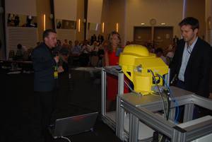 Podsumowaniem prezentowanych prelekcji było wystąpienie dr. inż. Jarosława Panasiuka z wydziału Mechatroniki i Lotnictwa Wojskowej Akademii Technicznej. Przedstawił on zagadnienia związane ze współpracą między robotem a człowiekiem ? m.in. wspieranie programowania robotów nie tylko przez ?przeciąganie?, ale też wskazywanie. Jesteśmy w stanie modernizować starsze roboty, nakładając na ich ramiona robocze sztuczną ?skórę? z czujnikami ? pojemnościowe pozwalają wyczuć człowieka, nie doprowadzając do fizycznego zderzenia czy kontaktu.