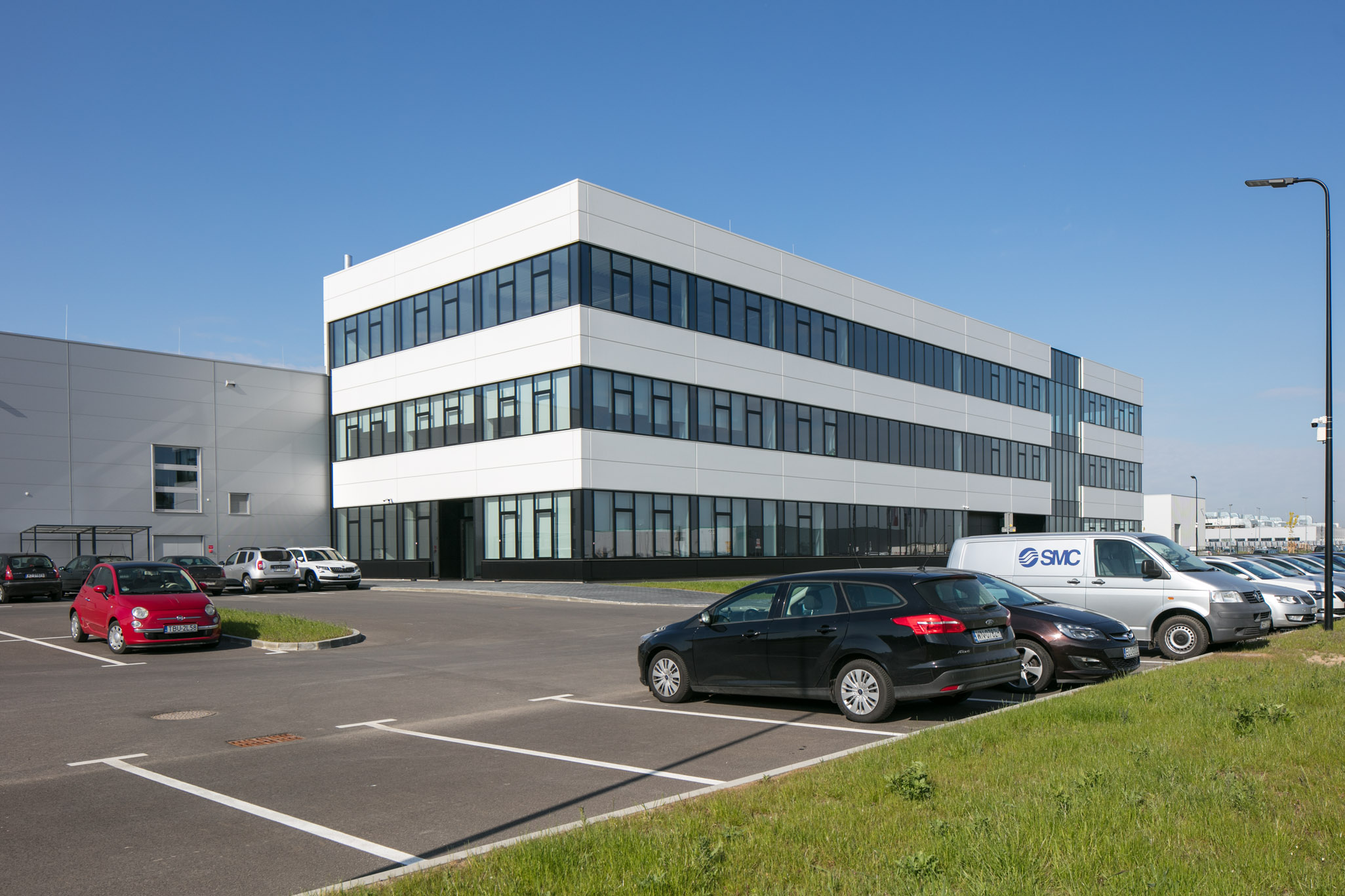 Siedziba główna SMC Industrial Automation Polska do tej pory mieściła się w Warszawie. Zakup 4ha działki Strefie Przemysłowej Pass, gdzie wybudowano budynek o powierzchni 8800 m2 nie oznacza zamknięcia warszawskiej siedziby, ale znaczne zwiększenie powierzchni jaką dysponuje SMC na potrzeby obsługi polskiego rynku. Inwestycja w gminie Błonie umożliwia jeszcze lepsze zaspokojenie potrzeb polskich klientów oraz otwiera nowe możliwości rozwoju SMC w Polsce. Budynek mieści halę o wielkości 4000 m2, a pozostała przestrzeń to część biurowa i techniczna, sale dydaktyczne oraz zaplecze socjalne. Na 2 z 3 dostępnych kondygnacji znajdują się między innymi buro Zarządu i Administracja oraz działy takie jak Product Management, Customer Service, Dział Logistyki, Dział Techniczny i Centralny Magazyn na Polskę. Zakupiona przez SMC działka i powstały na niej budynek zostały zaplanowane i zagospodarowane tak, aby dawać potencjał dalszej rozbudowy i rozwoju. Zbudowane już  budynki łącznie z parkingami i drogami dojazdowymi są ulokowane na połowie należącego do SMC terenu.