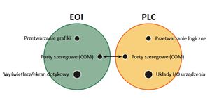 Jako uzupełnienie takiego prostego sterownika PLC wprowadzono elektroniczny interfejs operatora (Electronic Operator Interface ? EOI). Podłączony do PLC za pomocą prostego sieciowego połączenia szeregowego, interfejs EOI dodał możliwość prezentowania znacznie bogatszych informacji operatorowi maszyny, zastępując w procesie produkcji niektóre z przycisków i lampek kontrolnych. Tę historyczną relację pomiędzy EOI a PLC pokazano na rys. 3.