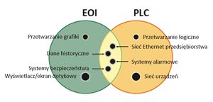 W przemysłowych sieciach Ethernet pojawienie się zdalnego dostępu do układów automatyki oznacza zwiększoną funkcjonalność, obejmującą: akwizycję i wymianę danych historycznych, powiadomienia i zarządzanie alarmami oraz zarządzanie bezpieczeństwem. Te cechy wprowadzono zarówno w PLC, jak też EOI. Obecnie wykazują one tendencję do nakładania się na siebie, ponieważ dostawcy sprzętu PLC i EOI rywalizowali w spełnieniu nowych wymagań dotyczących informacji historycznych, alarmowania i bezpieczeństwa (rys. 4).