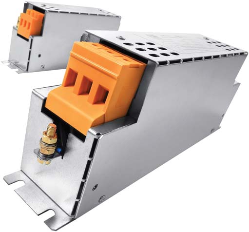 Filtry to klucz do łagodzenia EMI. Przedstawione na rysunku komponenty to fragment szerokiej oferty filtrów RFI/EMC firmy Block USA LP do napędowych przemienników częstotliwości i innych urządzeń energoelektronicznych. Trójfazowa seria HLD-110 stosowana po stronie zasilania może filtrować sygnały o napięciu o maksymalnym 520 V i prądzie do 30 A (na pojedynczą fazę).